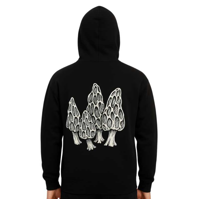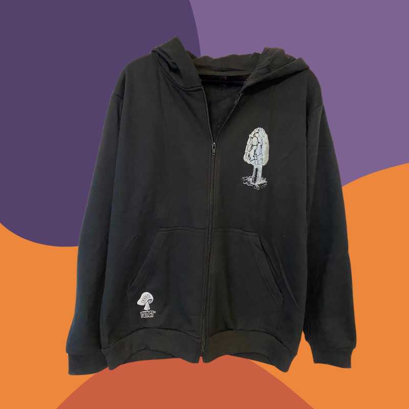 Polerón negro con estampado en serigrafía en pecho y espalda, con cierre. Diseño unisex.