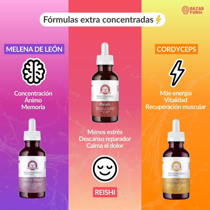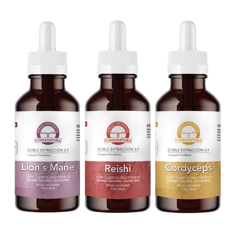Contenido: 1x Cordyceps militaris – 1x Lion’s Mane – 1x Reishi de 30 ml cada uno, extracción 3:1 – Funganatura.